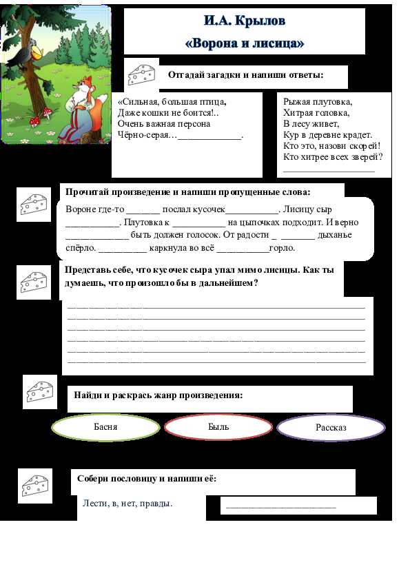 Рабочий лист к басне Л.Н.Толстого "Ворона и лисица"