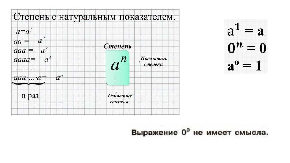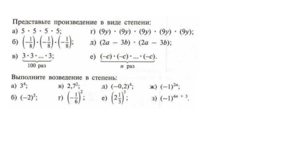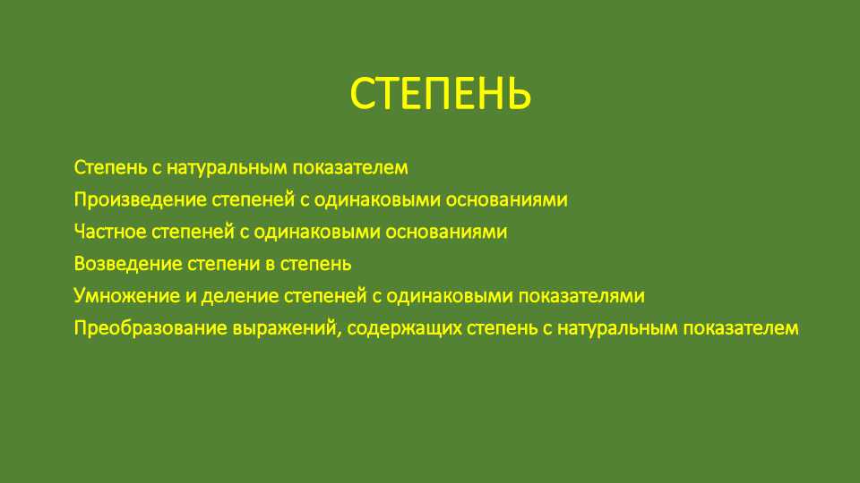 Материал содержит теорию и задания по темам "Степень с натуральным показателем", "Произведение степеней с одинаковыми основаниями", "Частное степеней с одинаковыми основаниями", "Возведение степени в степень", "Умножение и деление степеней с одинаковыми показателями", "Преобразование выражений, содержащих степень с натуральным показателем".