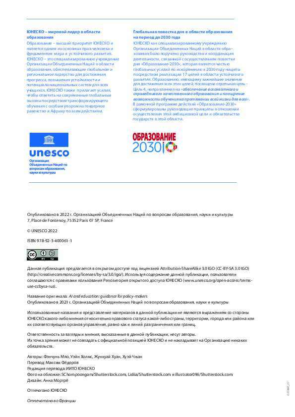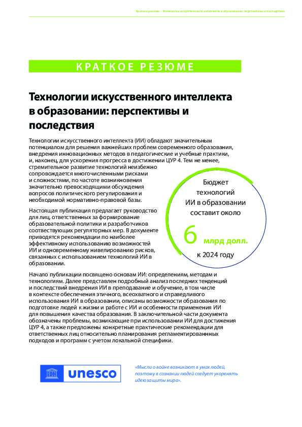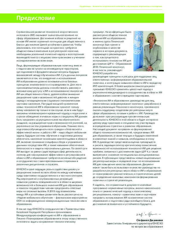 В начале настоящей публикации представлено краткое описание технологий ИИ – что они собой представляют и как функционируют, с целью обеспечения основы для подробного обсуждения вопросов взаимодействия между ИИ и образованием. Последующий раздел включает рассмотрение различных способов использования технологий ИИ в образовании, наряду с обсуждением того, как ИИ может способствовать укреплению всеохватности и справедливости образования, повышению качества обучения, оптимизации педагогической практики и управления образованием. Также большое внимание уделяется тому, как образование может помочь всем гражданам без исключения развивать навыки, необходимые для жизни и работы в эпоху ИИ. Далее подробно описываются основные стратегические цели: использование преимуществ и снижение рисков, ассоциированных с технологиями ИИ в образовании; рассматриваются проблемы, связанные с достижением этих целей. В заключительной части руководства предлагается набор рекомендаций, предназначенных для информирования о всеобъемлющем видении и планах действий в отношении формирования политики в области ИИ и образования.