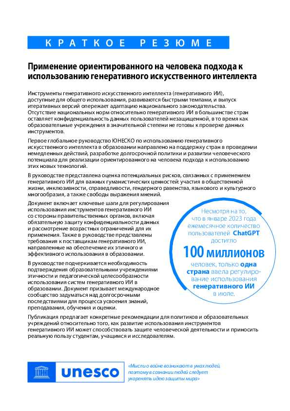 Инструменты генеративного искусственного интеллекта (генеративного ИИ), доступные для общего использования, развиваются быстрыми темпами, и выпуск итеративных версий опережает адаптацию национального законодательства. Отсутствие национальных норм относительно генеративного ИИ в большинстве стран оставляет конфиденциальность данных пользователей незащищенной, в то время как образовательные учреждения в значительной степени не готовы к проверке данных инструментов.