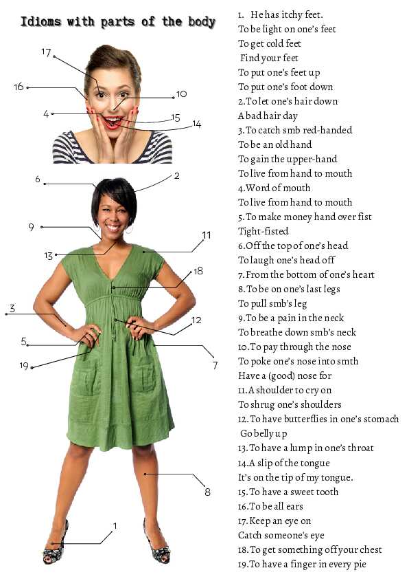 Эта яркая и удобная памятка собрала в себе самые популярные английские идиомы, связанные с частями тела. Материал подходит для учеников от уровня A2–B2, а также для учителей, которые хотят разнообразить уроки живой разговорной лексикой.