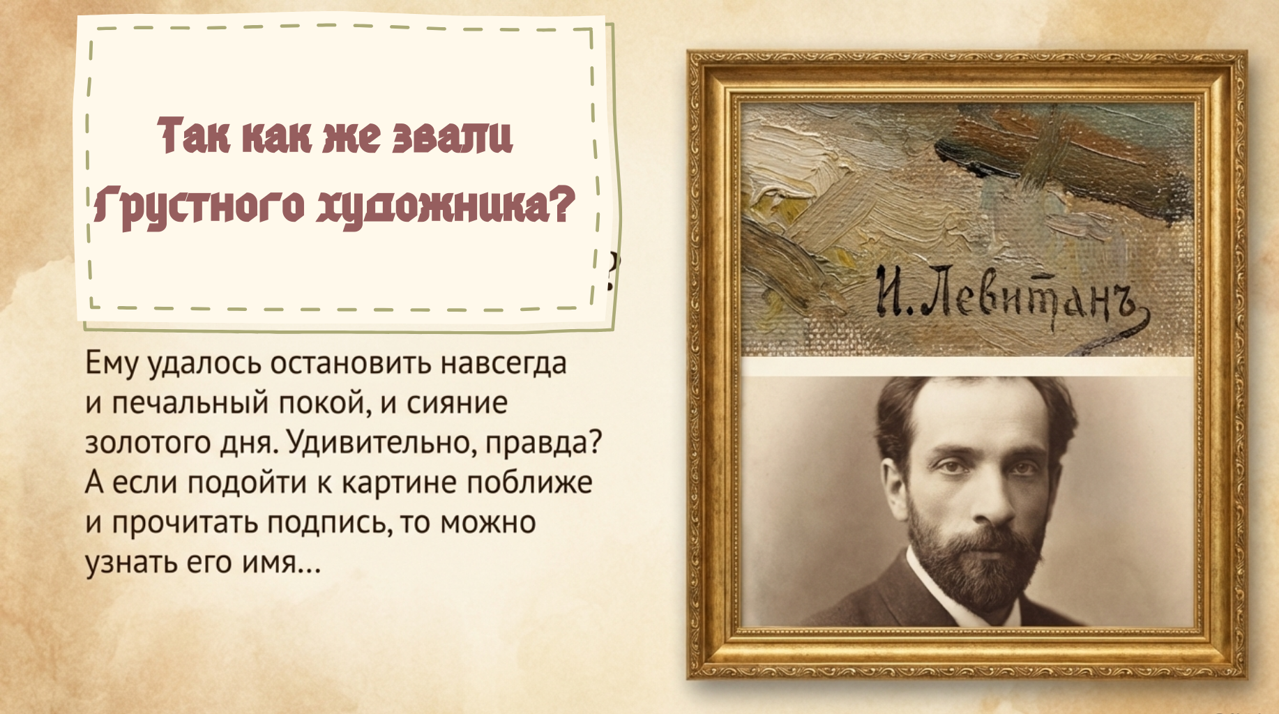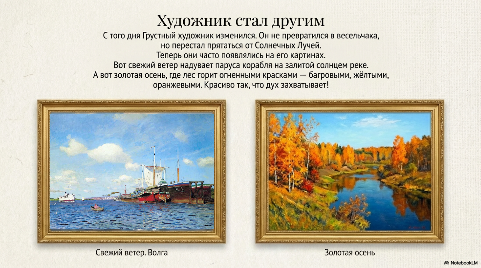 Продукт сочетает художественный рассказ, иллюстрации и элементы сказочного повествования. Подходит для уроков литературы, искусства, внеурочной деятельности и интегрированных занятий. Формирует эмоциональное восприятие, развивает образное мышление и интерес к живописи, помогает говорить с детьми о настроении, внутреннем мире человека и языке искусства.