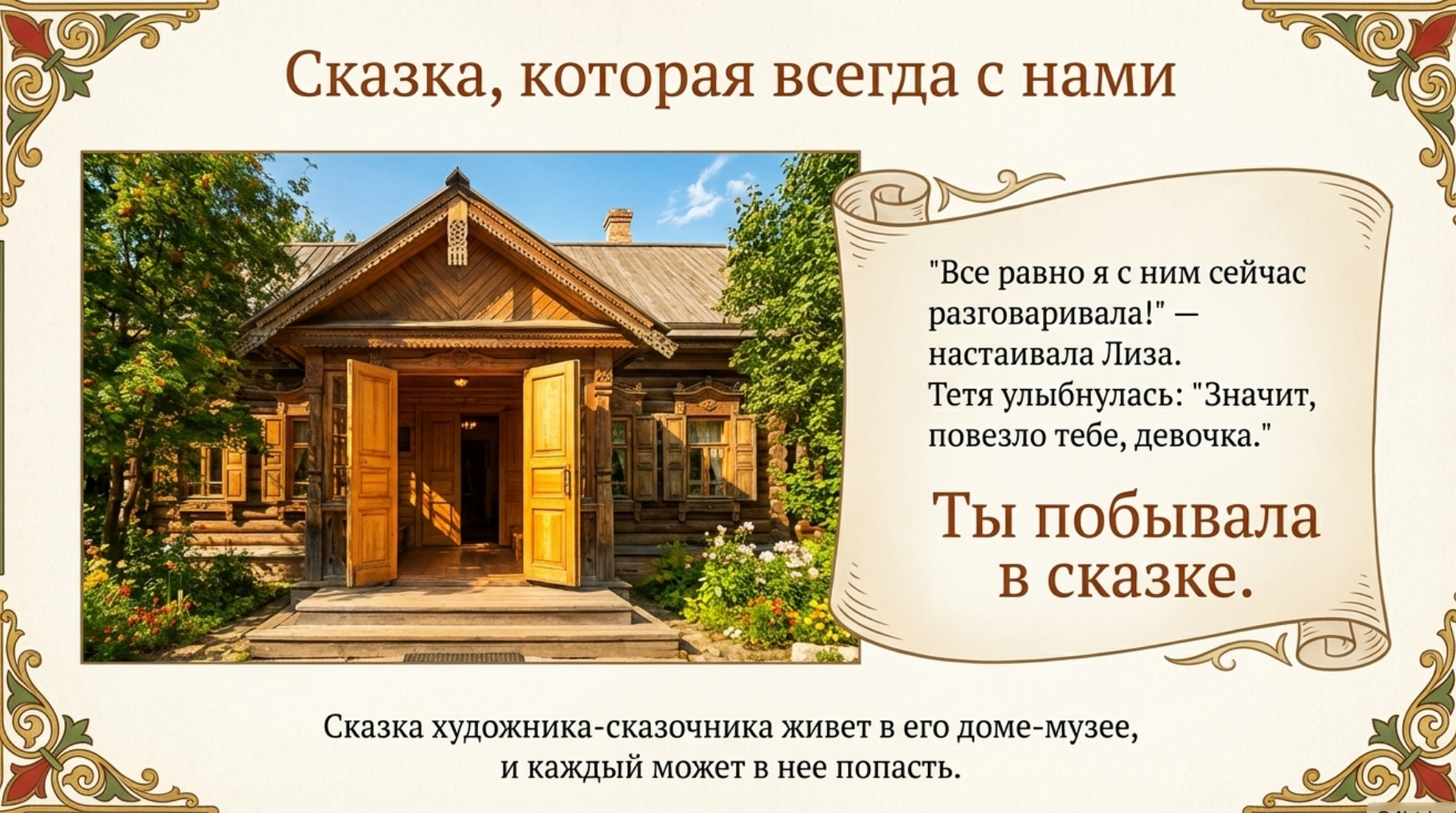 Это визуально-текстовый образовательный материал, на основе серии книг Г. Ветровой "Сказки о художниках" , погружающий детей в мир сказки, искусства и культурного наследия через образ художника и атмосферу его дома-музея, формируя эмоциональный отклик и интерес к живописи и чтению