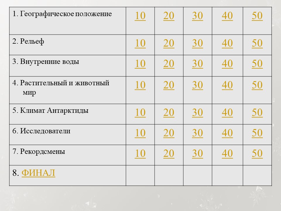 Игру можно организовать на уроке географии в рамках обобщения повторения темы «Антарктида» или во внеурочной деятельности в 7-9 классах. Данный материал представлен в формате викторины. Вопросы различной сложности.