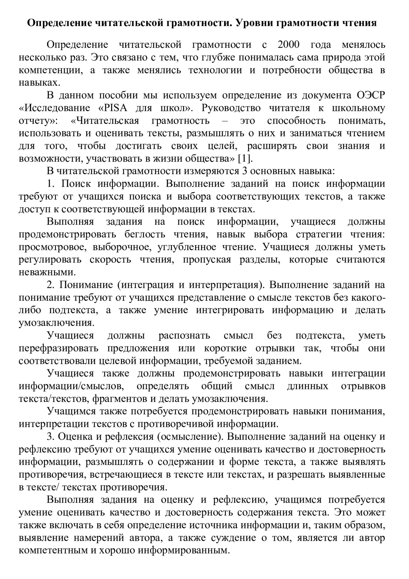 Разработано пособие для учителей языковых дисциплин (казахского, русского языков) в целях оказания помощи в разработке заданий, развивающих читательскую грамотность учащихся общеобразовательных школ, а также для повышения результатов Мониторинга образовательных достижений обучающихся. В пособии кратко приводится информация о компонентах читательской грамотности и способах её измерениях, принятых в международном исследовании PISA. Рекомендации по повышению скорости чтения и образцы заданий, которые рассчитаны на учащихся школ с русским языком обучения, изучающих казахский язык. Пособие также будет интересным и полезным для всех, кого интересуют вопросы развития читательской грамотности как надпредметной компетенции.