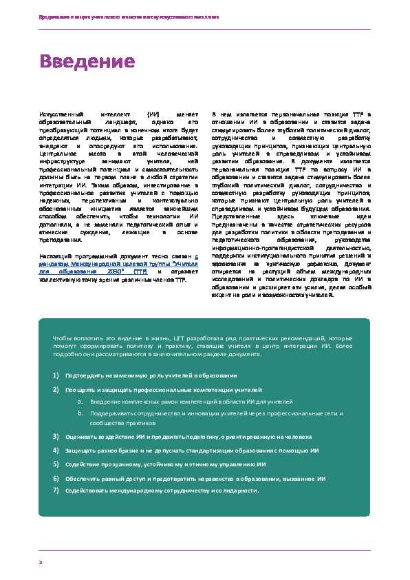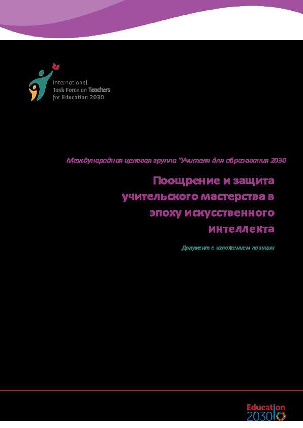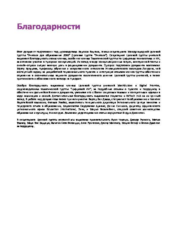 Этот документ подготовлен под руководством Карлоса Варгаса, главы секретариата Международной целевой группы "Учителя для образования 2030" (Целевая группа "Учителя"). Секретариат Целевой группы учителей выражает благодарность своим членам, особенно членам Тематической группы по цифровым технологиям и ИИ, за активное участие в процессе консультаций. Их вклад в виде консультационных встреч, электронной почты и онлайн-опроса сыграл важную роль в формировании документа. Процесс подготовки документа возглавлял Мутлу Кукурова, профессор обучения и искусственного интеллекта Университетского колледжа Лондона, чей экспертный надзор за разработкой первоначального проекта и интеграция отзывов членов группы обеспечили отражение в окончательном варианте документа коллективного мнения Целевой группы учителей, а также критического и обоснованного взгляда на предмет.