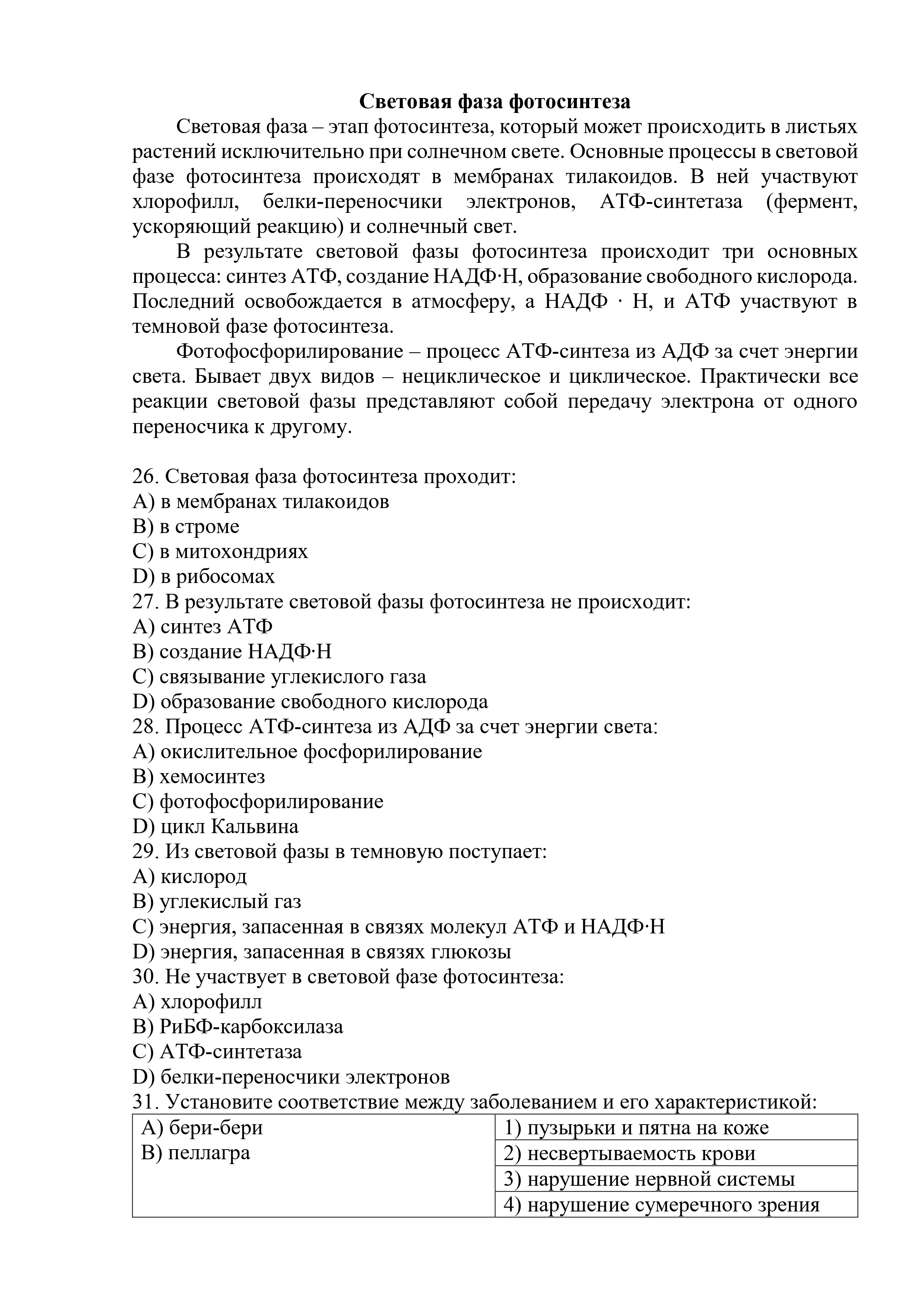 - 5 вопросов на основе контекста на тему "Световая фаза фотосинтеза";