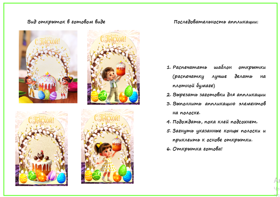 Методическая разработка предназначена для детей дошкольного и младшего школьного возраста, для создания открытки к светлому празднику Пасхи. В методической разработке представлены заготовки для распечатки, вырезания и наклеивания. В зависимости от умений детей, воспитатель детского сада или учитель в школе может помочь вырезать заготовки, а дети выполнят только аппликативные работы. Дети младшего школьного возраста могут и вырезать, и сделать аппликацию. В разработке даны пояснения по работе с шаблонами для распечатки и наклеивания. Распечатку шаблона и заготовок для открыток лучше выполнять на плотной бумаге (матовая фотобумага).