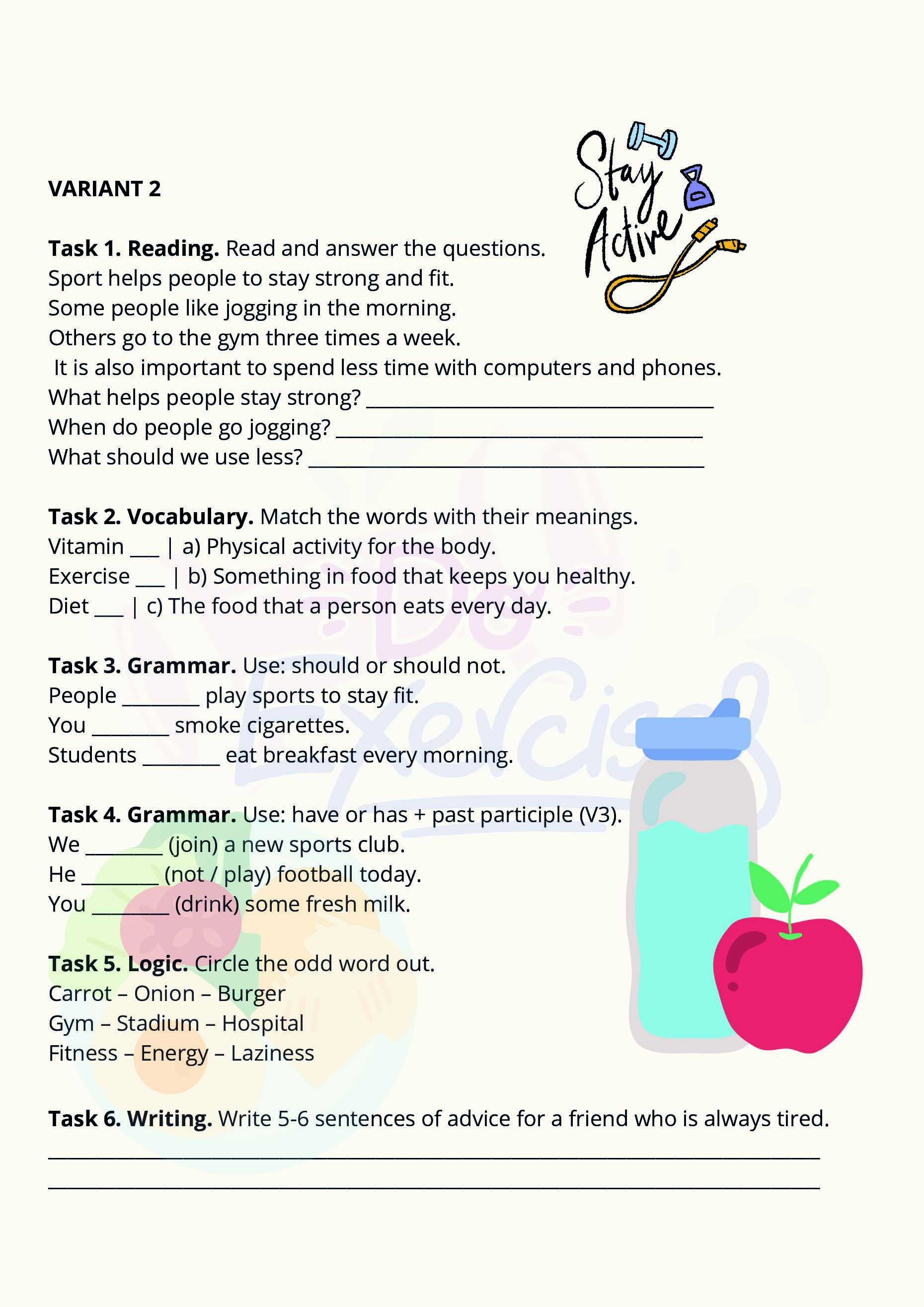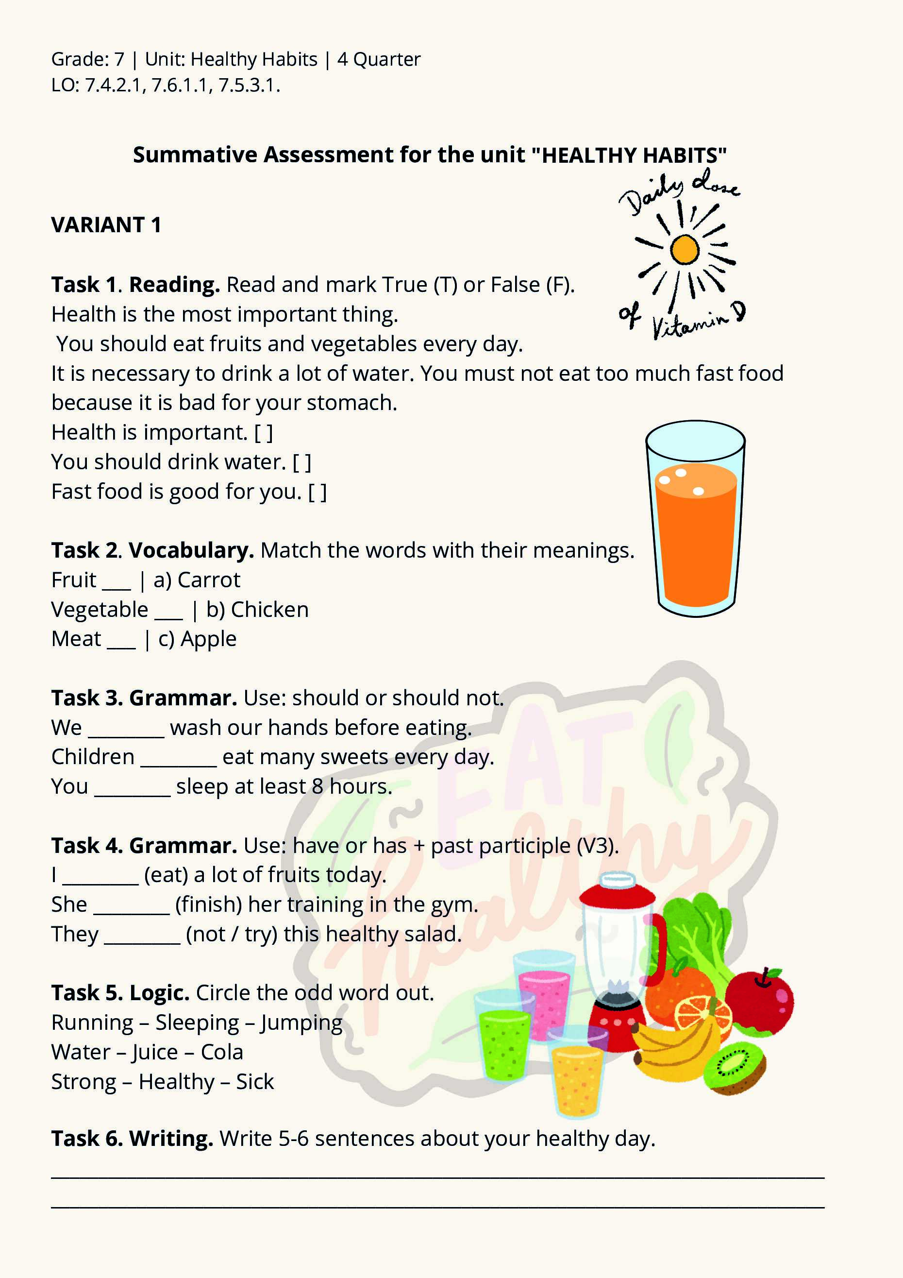 Сборник проверочных заданий призван разнообразить контрольно-измерительный материал, предлагаемый типовым учебным планом, а также закрепить лексику и грамматику модуля «Healthy Habits». Красочно оформленные странички помогают стимулировать и поддерживать интерес семиклассников к предмету во время проверки знаний.