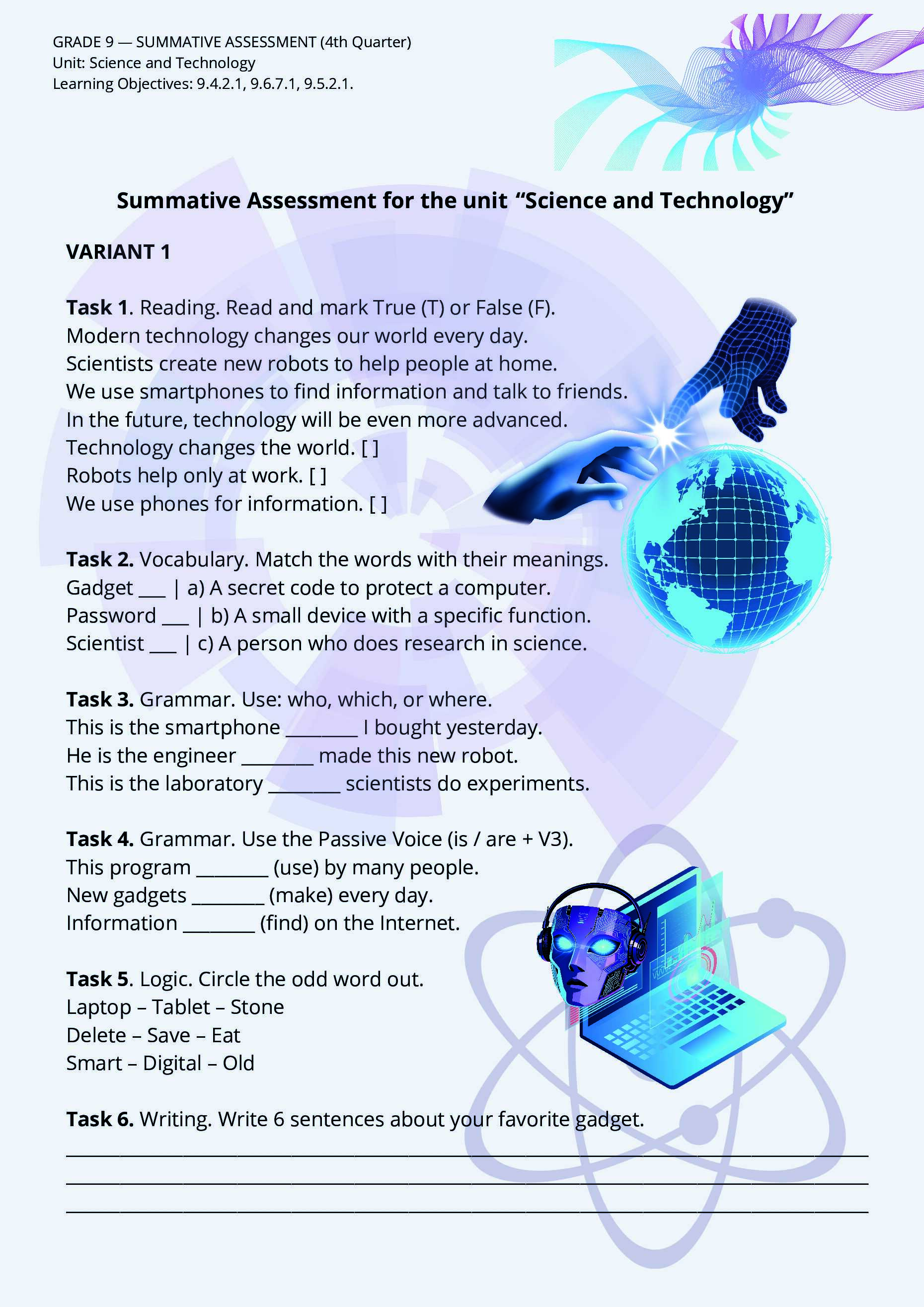 Данная методическая разработка (Summative Assessment) предназначена в помощь учителю для контроля знаний учащихся 9 класса по теме «Science and Technology» в рамках программы 4-й четверти. Материал полностью соответствует учебному плану и целям обучения (Learning Objectives), заложенным в обновленной программе РК.