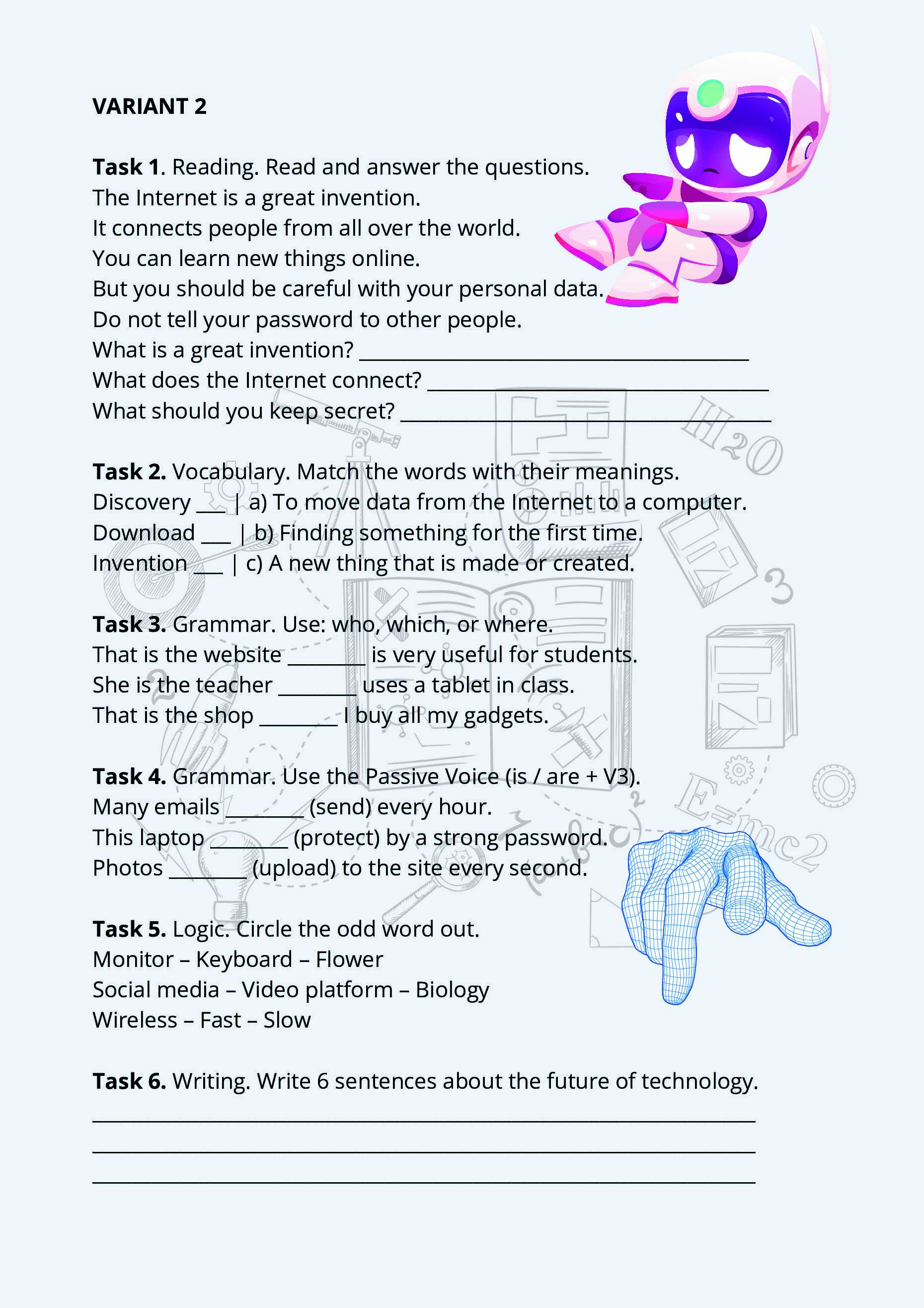 - "Your Turn" (9.5.2.1): Творческое письмо-рассуждение (Short essay) о влиянии технологий на жизнь человека.
