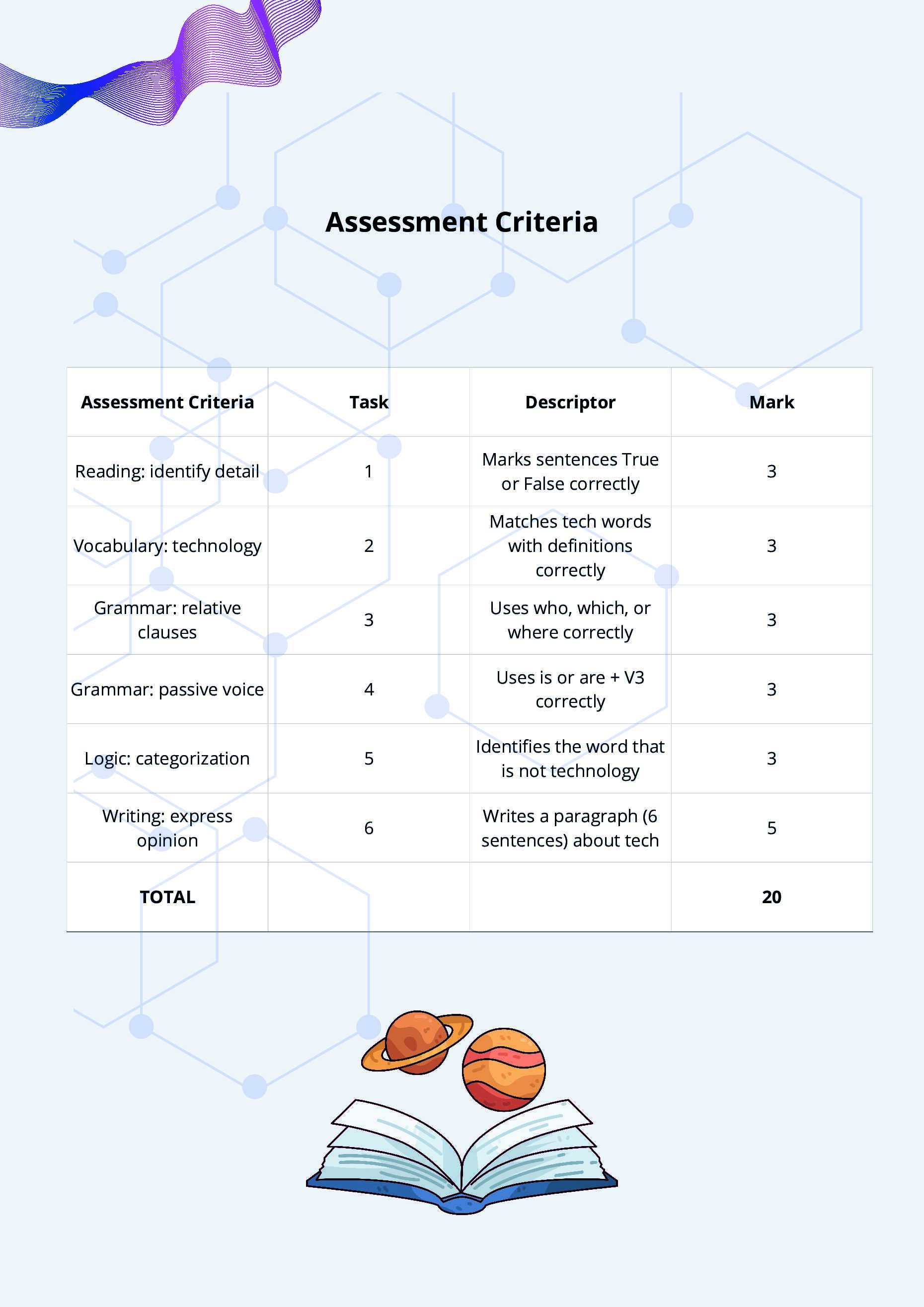 - Grammar Focus (9.6.7.1): Употребление сложных грамматических структур (например, Use of Passive Voice или Conditionals в контексте технологий).