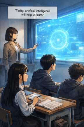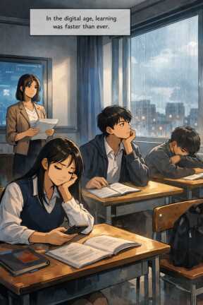 Содержание и тематика: Комикс иллюстрирует роль технологий в современном образовании. Визуальный ряд (выполненный в стиле аниме) демонстрирует учебный процесс в классе: