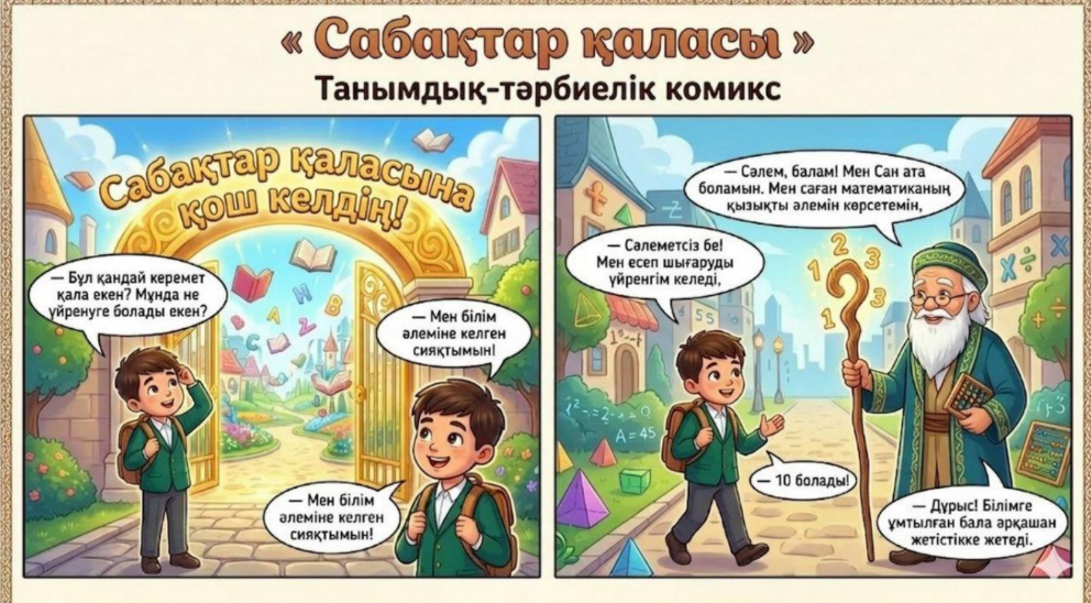 Познавательно-воспитательный комикс на казахском языке о путешествии мальчика Айдоса в сказочный город знаний. Герой встречается с персонажами-символами: Дедушкой Цифрой (математика), Тетушкой Буквой (родной язык) и Матерью-Природой. Материал учит, что знания — это неисчерпаемое сокровище, а вежливость и любовь к природе — главные украшения человека