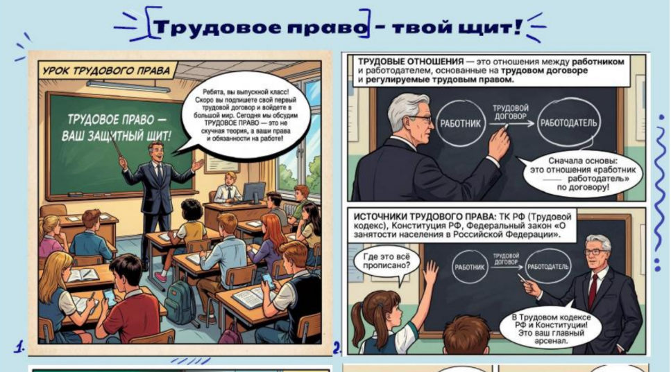 Креативный учебный материал, в котором опытный учитель проводит для выпускников урок по трудовому праву6. В доступной форме комикса разъясняются основы заключения трудового договора, а также права (безопасность, оплата, отдых) и обязанности работников67. Работа учит молодых специалистов защищать свои интересы в рамках закона.