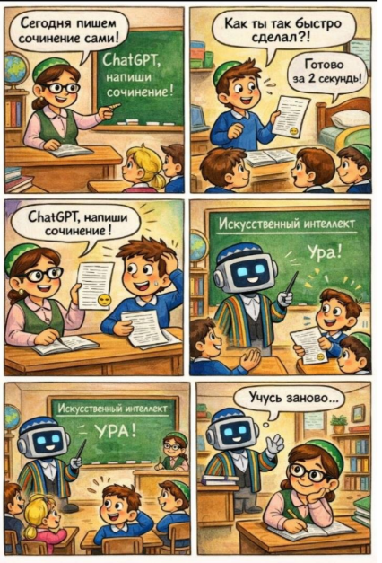 Сатирический и поучительный взгляд на использование искусственного интеллекта в школе. История показывает, как ученики пытаются заменить самостоятельную работу нейросетями, и как в классе появляется робот-учитель. Главная мысль заключается в том, что технологии меняют процесс обучения, заставляя и учеников, и учителей постоянно адаптироваться и учиться новому